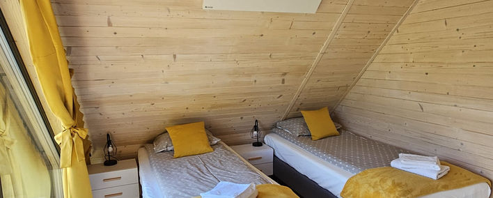 Sypialnie- 2 oddzielne zamykane pokoje z panoramicznymi oknami z których każdy wyposażony jest w 2 pojedyncze łóżka (z możliwością zsunięcia) komodę, fotel, stoliki nocne z lampkami oraz wieszak na ubrania.